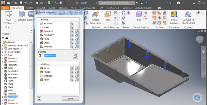 A new Feature Relationships tool identifies parent and child relationships between part features. This helps you quickly understand how parameters define the model, and can be used to execute or automate geometry changes.