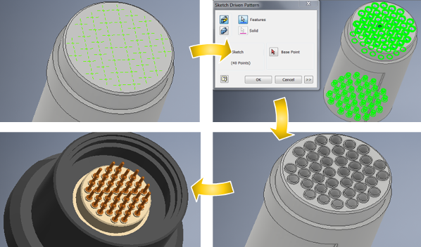 Similar to sketch-driven patterns for parts, sketch-driven patterning for assemblies enables you to position parts in complex arrays defined by a sketch.