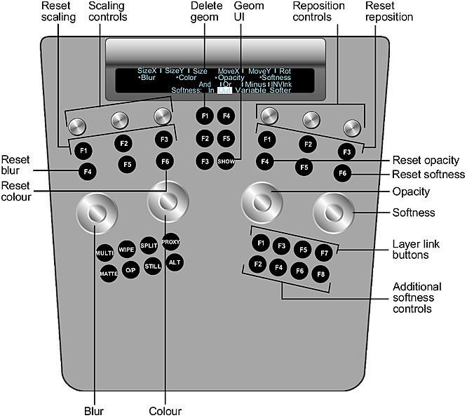 | Wheels | Modify the geometry's blur, colour, opacity, and softness. Wheel 1=Blur Wheel 2=Colour Wheel 3=Opacity Wheel 4=Softness The direction for edge softness is inwards or outwards depending on the direction that you rotate the wheel. To reset a wheel, press the button above it. |