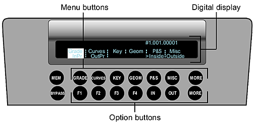 You can see which options are available by checking the digital display. For example, in the following illustration the Grade menu has been selected and the InPr, OutPr, Inside, and Outside options appear in the digital display. The location of these options in the digital display is the same as their location amongst the option buttons.