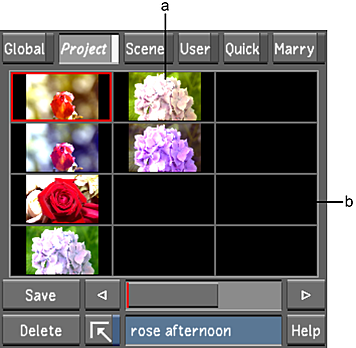 If you save grades to a Marry Grade bin, each selected grade is saved in a separate storage container in the current container position (highlighted in red) in the Grade bin for the shot.