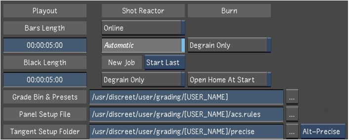 Use the System & Menu Settings page to configure the backup options, change shot settings, assemble options, match options, playout settings and background render user preference as well as the panel setup file and the user grade bin and presets directory for this user.