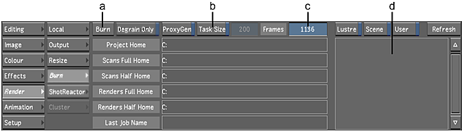 (a) Burn button (b) Task Size button (c) Frames field (d) Job list