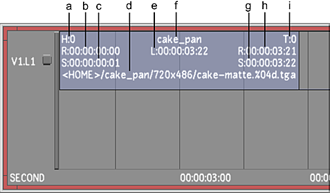 (a) Head (b) Start record timecode (c) Start source timecode (d) Shot location (e) Length of element (f) Name of element (g) End source timecode (h) End record timecode (i) Tail