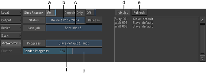 (a) ShotReactor On/Off button (b) Status field (c) Last Job field (d) Job List (e) Job List Refresh button (f) Progress field (g) Render progress bar