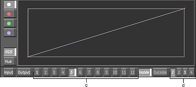 - When selected, the secondary grading is applied inside the geometry. This is the default. In order to view the grading, make sure the button is activated (i.e., the text is white). If not, right-click the button to activate it. See Colour Grading Inside and Outside Secondaries.