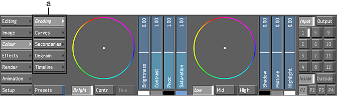 Use the Colour menu to access the Grading, Curves, Secondaries, Degrain, and Timeline menus.