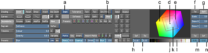 (a) Keyer option box (b) Show Diamond Keyer (c) Hue cube (d) Sampled pixel (e) Chrominance Softness Diamond (f) Chrominance Tolerance Diamond selector (g) Chrominance Softness Diamond selector (h) Minimum Luminance slider for softness (i) Minimum Luminance slider for tolerance (j) Luminance level of sampled pixel (k) Chrominance Tolerance Diamond (l) Luminance gradient (m) Maximum Luminance slider for tolerance (n) Maximum Luminance slider for softness