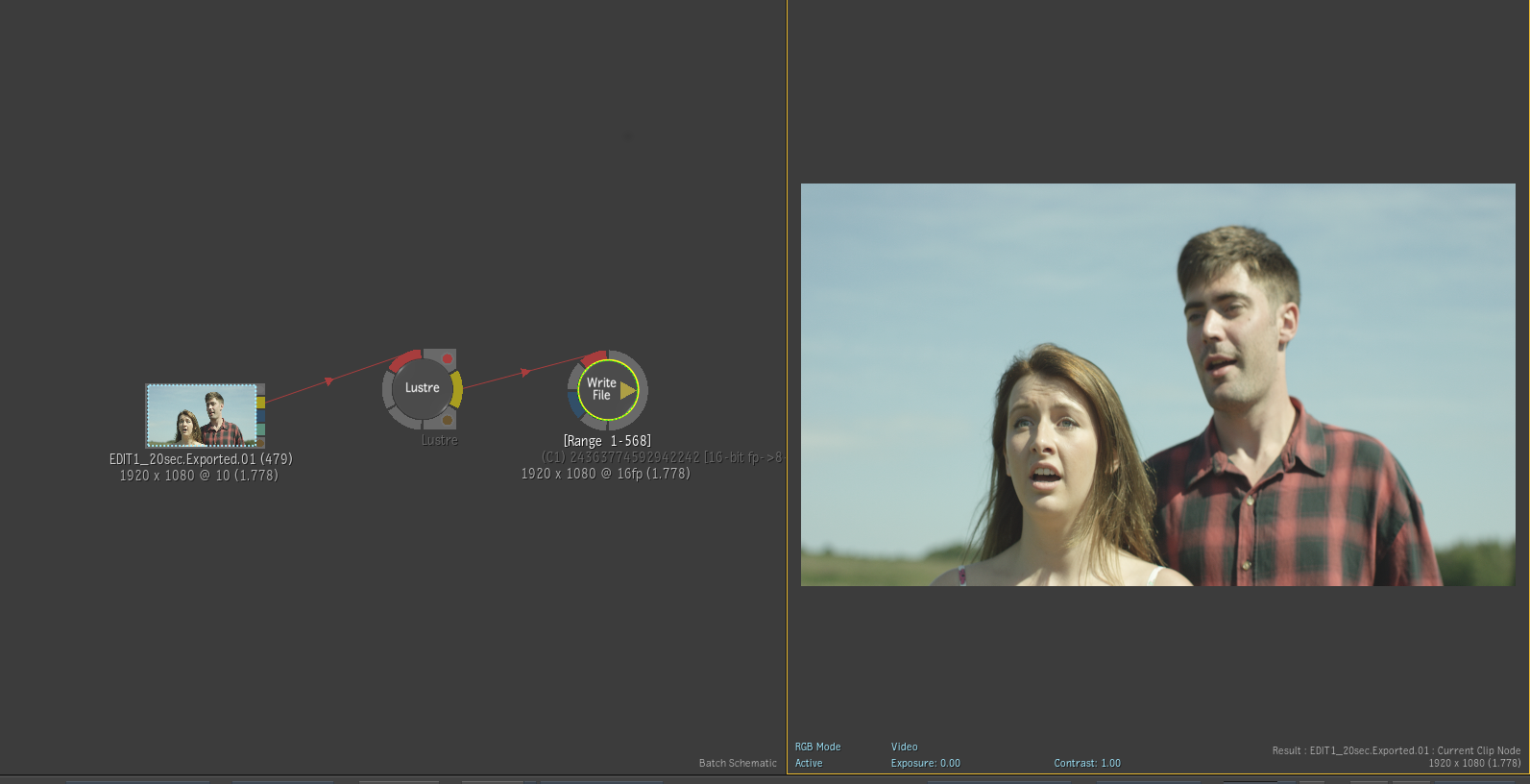 You're grading a shot in Lustre and would now like to add, say a Glow effect to the shot. You can promote the shot (including matte containers and external mattes) along with all of the grading data from the Lustre pipeline to Batch. The Lustre pipeline is represented as a Batch node. From there you can insert effects nodes (in our example, a Glow) before, after or in between the different stages of the Lustre pipeline (after exploding the Lustre node). Once you are happy with the effect, you render the shot in Batch and it immediately becomes available in Lustre, with the added effect(s) and the grade intact. Note that any grading done on top of the effect remains live in Lustre.