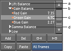 Use the Channel hierarchy to select the channels to animate. In the following example, Green Gain is selected. You can then set keyframes for this channel and create an animation. See Animating with Keyframes.
