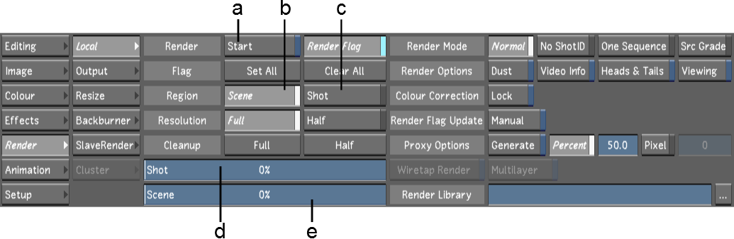 (a) Start button (b) Region Scene button (c) Region Shot button (d) Shot progress bar (e) Scene progress bar