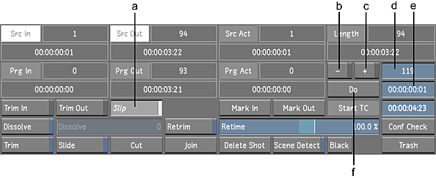 (a) Slip button (b) - (minus) button (c) + (plus) button (d) Frame field (e) Do field (f) Do button