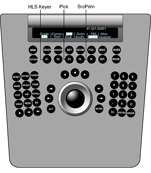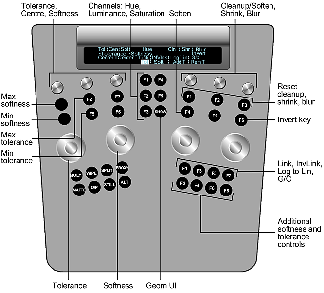 | Buttons in centre column | Adjust tolerance, centre, and softness values separately for each of the channels forming the basis of the key. F1=Hue F2=Luminance F3=Saturation |