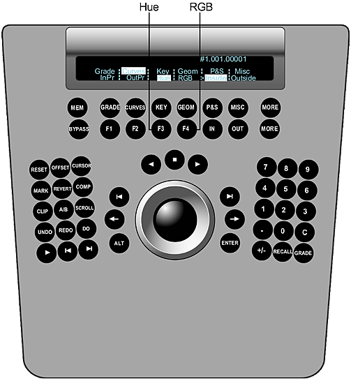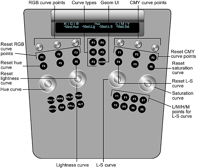 | Buttons in centre column | Select the type of curve to be modified using the RGBCMY curve points. F1=Hue F2=Light F3=Saturation If you press the F1 button when working with RGB curves, you are toggled to Hue curves. |