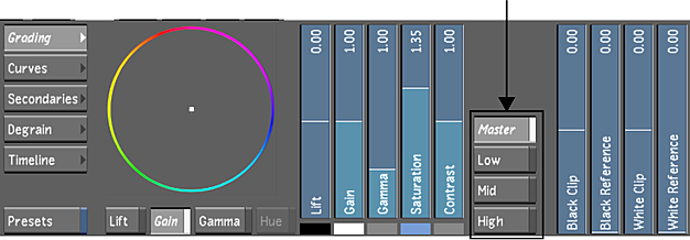 Note: When you use a slider or colour balance wheel to colour grade a shot, the colour range is limited by the control (the edge of the colour wheel, for example). Use the Autodesk control surface or the Tangent CP100 control surface to reach the full spectrum of colour.