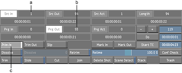 (a) Src Out field (b) Trim Out button (c) Prg Out field