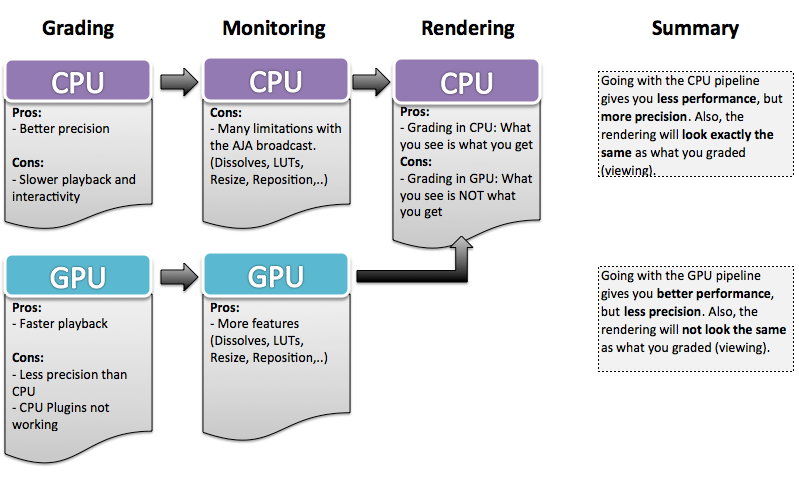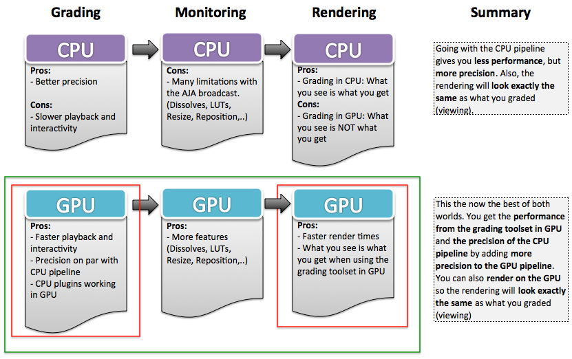 The GPU can be used for both interactive and grade rendering. This is a high fidelity solution, meaning that decisions made in the grading suite now correspond to what is rendered on disk.