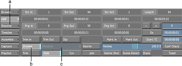 (a) Dissolve menu button (b) Dissolve button (c) Duration slider