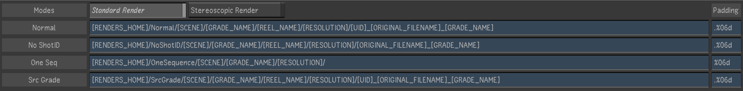 - Defines the padding of the file name (the number of digits used for file numbering) for each render mode. For example: <NormalPadding string=".%06d" /> will generate a six digit file like this: filename.123456.dpx.