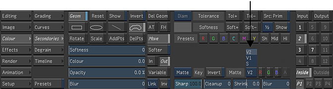 In the following screenshot, the matte on the V2 track is applied to the second secondary colour grading layer.