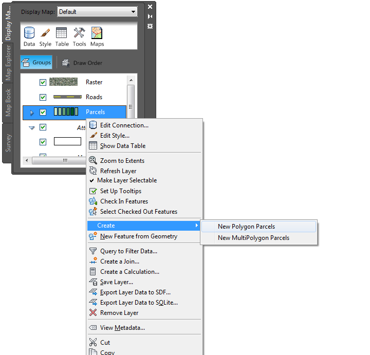 Each item in AutoCAD Map 3D has a custom menu that contains commands available for that item at the current time.