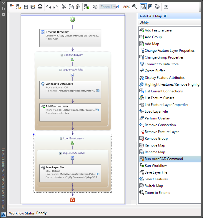 In this case, the ForEach activity has been renamed “LoopAddLayers” to describe what it does. The activity examines each SDF file in the folder designated in the Expose Directory Contents activity. For each iteration, it connects to an SDF file and adds a feature layer to Display Manager.