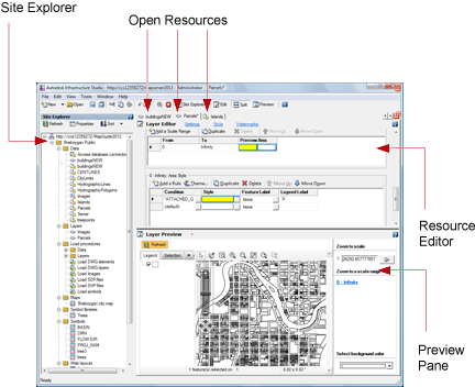 In the Autodesk Infrastructure Studio application window, use the Site Explorer to access the resource repository and the editor pane to define and edit resources.
