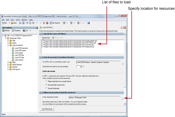 This procedure assumes that you have one or more SDF 2 or SDF 3 files that you want to load. To load an SDF file, you drag one or more source files to the Site Explorer. Autodesk Infrastructure Studio converts SDF 2 files to SDF 3 format and automatically creates a new layer for each file as well as a new feature source.