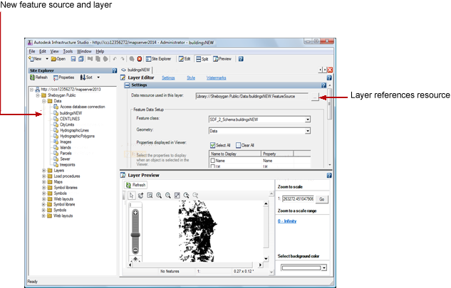 Autodesk Infrastructure Studio creates a new feature source and a new layer for each SDF file.