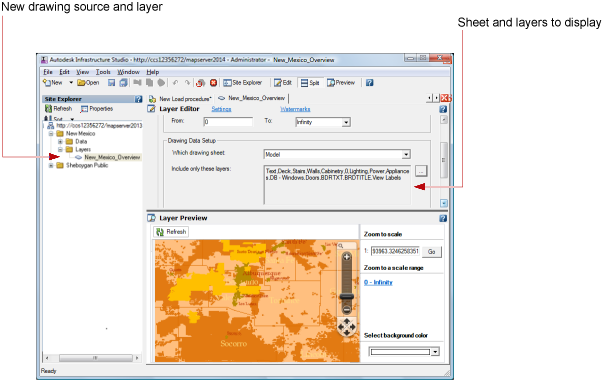 This procedure assumes that you have one or more DWF files that you want to load. To load a DWF file, you drag the source file to the Site Explorer. Autodesk Infrastructure Studio automatically creates a new layer as well as a new feature source.