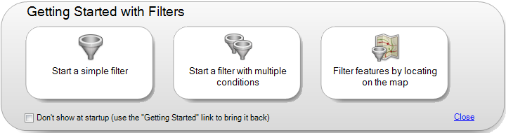 To prevent these startup buttons from displaying each time you create an expression, select the Don’t Show At Startup check box. You can redisplay them later by clicking Getting Started.