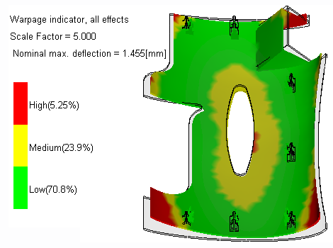 This result shows the relative magnitude of the warpage (out of plane change in shape) for the parts. Green areas are less than 80% and red areas are at least 120% of the Nominal max. deflection. The default value for Nominal maximum deflection is half the average wall thickness of the part. This result is shown in the result legend and is also listed in the Warpage Constraints