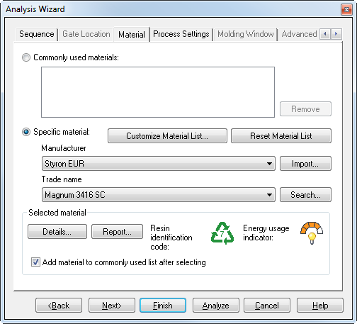 In this task, you select the thermoplastic material used to mold the part, and start the analysis.