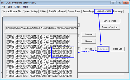 To check the log, you must have the Network License Manager installed on your computer. Open LMTOOLS, and click View Log on the Config Services tab.