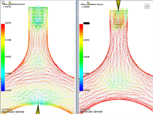 The Fiber orientation tensor result shows the degree of orientation of fibers at the end of the molding process.