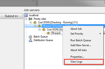 ()), hover over an analysis in the Job servers list then click the right mouse button and select View Logs from the drop-down menu