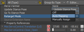 Turn on Mirror Animation when you retarget animation to apply mirrored animation from another character's extension to a target character's extension. You must set an Character Extension Retarget mode and select the source character.