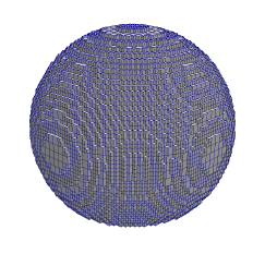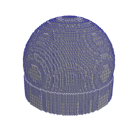 An Inconel 625 spherical geometry with support structures is built in a powder bed system using generic processing parameters. Both the part and support structure geometries are imported in the analysis through STL files and both are automatically meshed within Project Pan . The buildplate is modeled to be 10.88 mm thick using *DDM!. The time to deposit layers is calculated using the *PBDL card, here modeling the case where 5 identical geometries are built at once. The simulation is run twice, once without including powder, and one including powder in the multiscale analysis, using the *+PDR card. Powder properties are automatically scaled. Thermal conductivity of the powder is 0.01× that of the solid while specific heat is 0.6× that of the solid property. The bottom of the build plate is fixed using the *FSUB card. The *FSUB card will also simulate the release of the buildplate from the machine after the deposition process is complete, but before the part is removed from the buildplate. The mesh, shown with support elements, without support elements, and a cross section from the thermal analysis, with meshed powder, is shown in Figures 12.1.