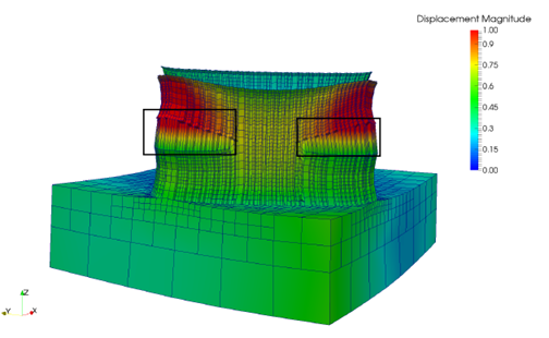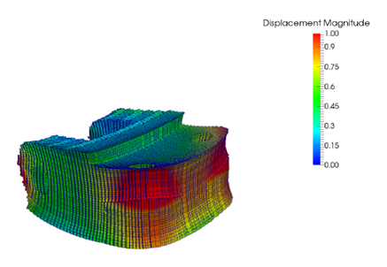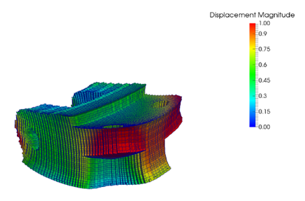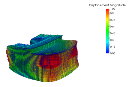 Figure 7.4 shows the computed final distortion from the support structure failure analysis using *UTSR (m2.in) after the part is removed from the build plate, and after the support material has been removed. Note the increase of distortion and elongation of failed elements. This phenomenon is shown more clearly in Figure 7.5.