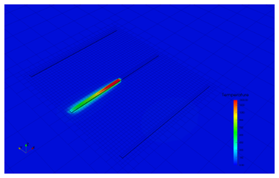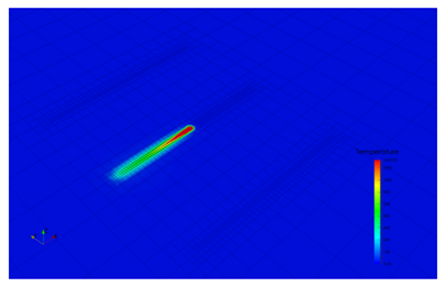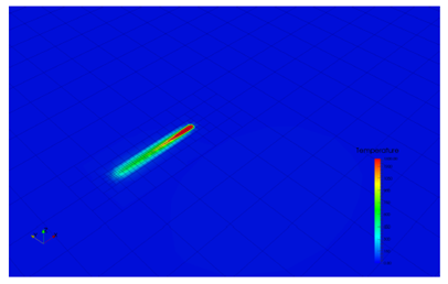 Results may be imported and viewed in ParaView. Figure 8.1 shows the results of each of the 2 substrate thermal simulations and Figures 8.2 shows the results of each of the 2 powder sintering thermal simulations, each during the simulation of the second laser scan.