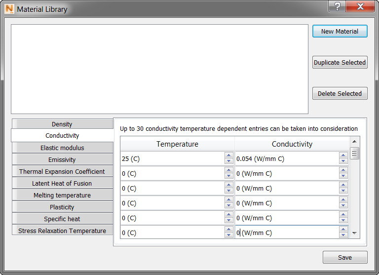 There are some minimum requirements for material properties, depending on how the material is used. For build plates, the minimum requirements are Thermal Conductivity, Density, Specific Heat, Coefficient of Thermal Expansion, and Elastic Modulus. These same properties are required for PRM generation, as well as Plasticity data.