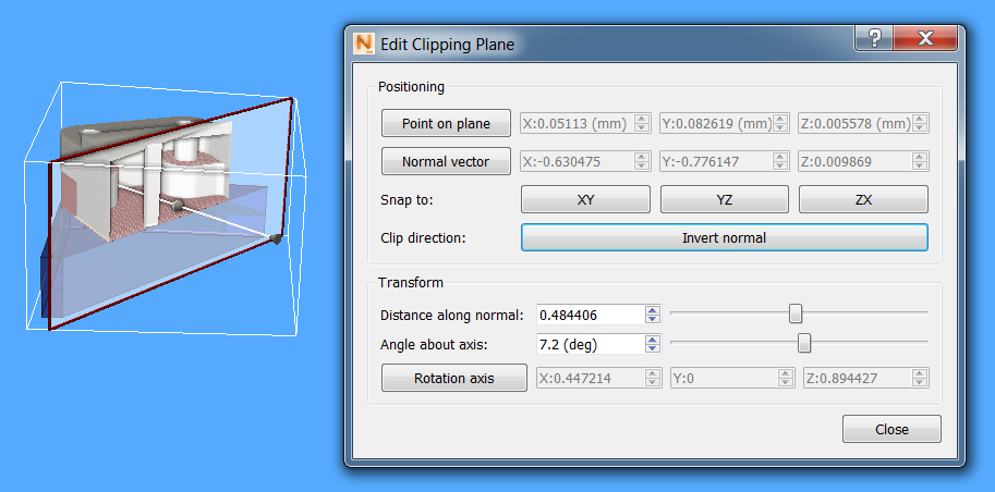 When the clipping plane is in the correct location, click Close to hide the clipping plane, while still displaying the cross section. If you want to edit the plane again, click