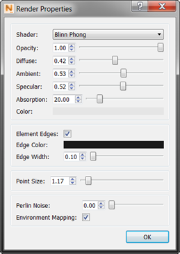Set the Shader value to either Blinn Phong, Gouraud, or Flat, then adjust other features such as lighting, opacity, and the presence of element edges. Experiment with effects by using the slider for each feature. Numeric values are shown if you need to replicate the effect at another time. You can always reset the rendering by clicking