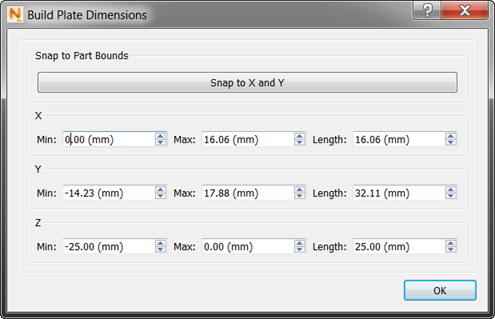 Review and modify the build plate dimensions in the Build Plate Dimensions window.