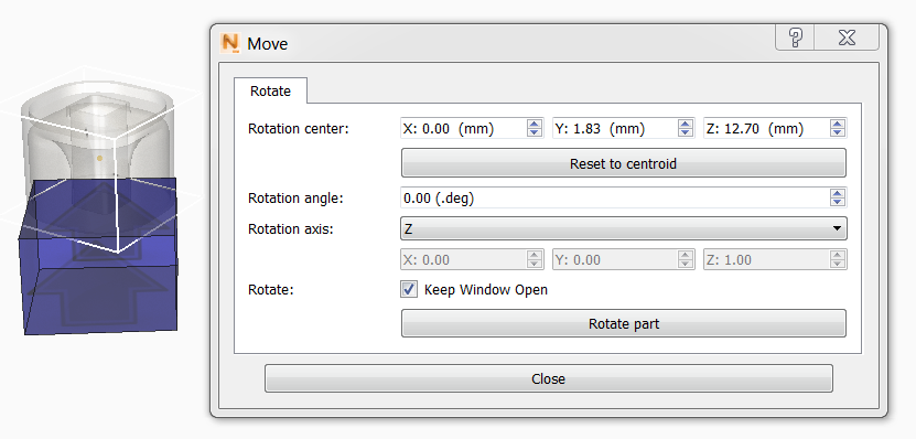 - Click the part, hold the mouse button down, and move the part freely about the centroid, which appears as a dot in the centre of the part.