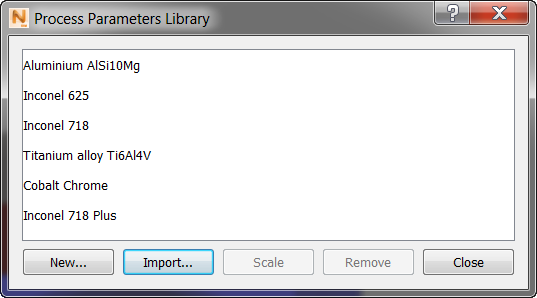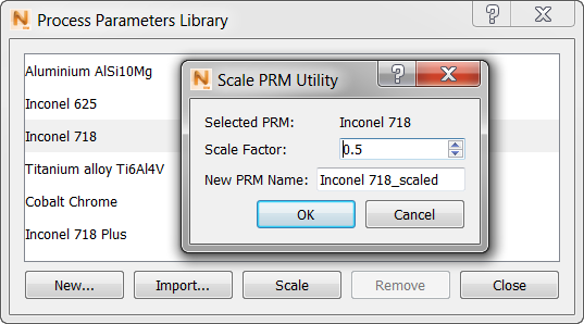 Click to open an existing process parameter (PRM) file from the library of files, import a PRM stored elsewhere, or scale a PRM file.