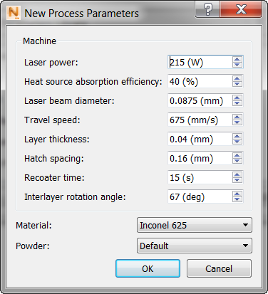 - Laser power [W]: The nominal laser heat input of the powder bed system for the simulated build.