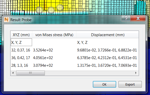 Result Probe to investigate how temperature, displacement, and stress results are distributed around the part, build plate, or support structure. Click on a point of interest, and a bubble marker appears in the view, while the Result Probe dialog displays numeric values for that point. Ctrl-click a series of points, and the Result Probe dialog displays the values for each point in a table. Enlarge the window or scroll to the right to see additional data columns.