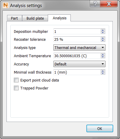 - On the Analysis tab, optionally use the Deposition Multiplier to scale the timing between increments to account for building multiple parts on the build plate. For example if there are 12 identical parts on the build plate, and you want to simulate only 1 of the parts, enter a value of 12.