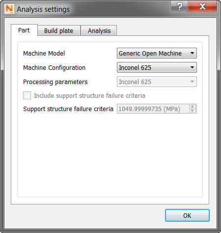 If you want to select a custom PRM file, set the Machine Configuration to Custom, and select a file in the Processing parameters field. The custom option also allows you to input your own material properties for part-level powder bed simulations.